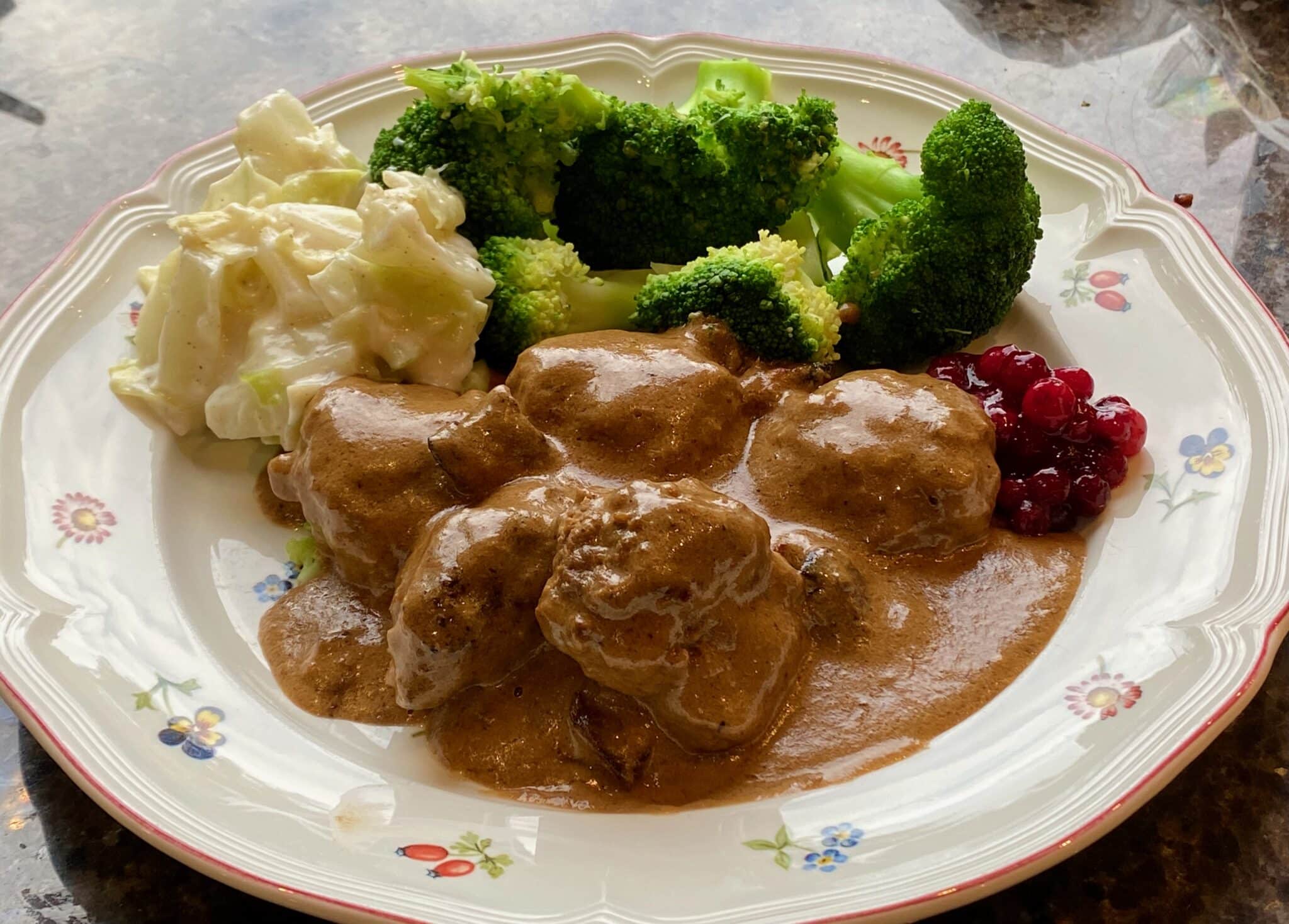 Kjøttkaker i brun saus med stuet spisskål